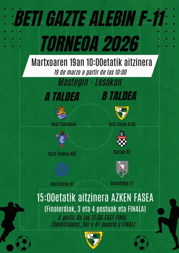 Beti Gazte ha organizado un Torneo de Fútbol F-11 de Alevines para el próximo 19 de marzo, jueves. Aprovechando que es día de fiesta, el campo Mastegi de Lesaka se convertirá en un gran día de fútbol, a partir de… Seguir leyendo →