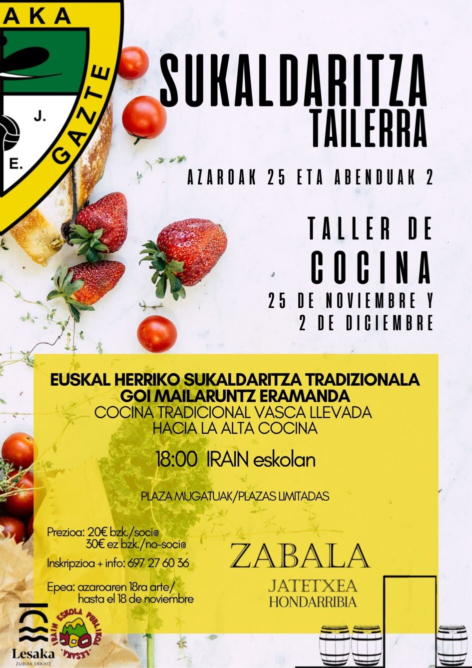 Heldu den azaroaren 25ean eta abenduaren 2an sukaldaritza tailerra eginen dugu Beti Gazten, Hondarribiako Zabala jatetxeko sukaldarien eskutik. Euskal Herriko sukaldaritza tradizionala erakutsiko dute, goi mailaruntz eramanda. Tailerrean gourmet menua prestatuko dute partehartzaileek, hainbat teknika desberdin erabiliz. Irain Eskolan eginen da kurtsoa, bi egunetan, 18:00etan.Tailerraren prezioa 20 eurokoa izanen da Beti Gazteko bazkideentzat eta 30 eurokoa bazkide ez direnentzat. Izena emateko idatzi 697 27 60 36 whatsapp zenbakira, azaroaren 18ra arte. Plazak mugatuak dira beraz, azkar ibili!
