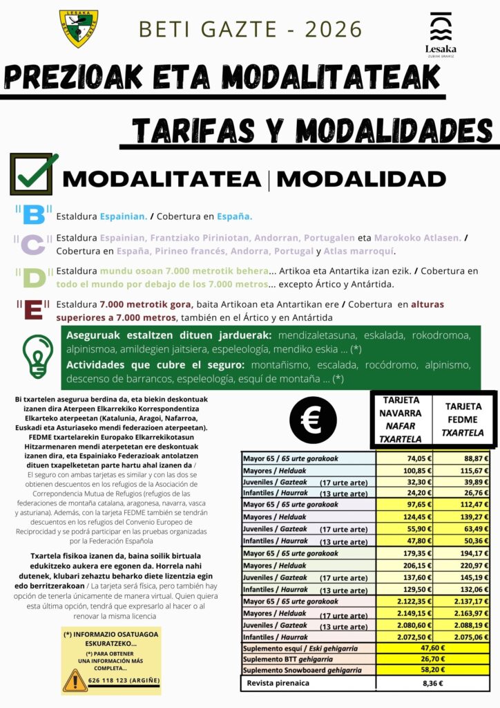 Beti Gazte ha abierto el plazo para dar de alta, baja o hacer cambio en las licencias de montaña de 2026. Los cambios se podrán hacer hasta el 7 de diciembre, por WhatsApp (626 118 123, Argiñe), enviando un email (mendia@betigazte.net) o acudiendo a la sede en el siguiente horario: el 1 de diciembre de 17:30 a 19:00, o el 4 de diciembre de edo 16:00 a 17:15era. Si no se pasa aviso alguno, la licencia se mantendrá en la misma modalidad que el año anterior. La licencia se cobrará a mediados de diciembre. Aquí tenéis las modalidades y los precios de las licencias de 2026.