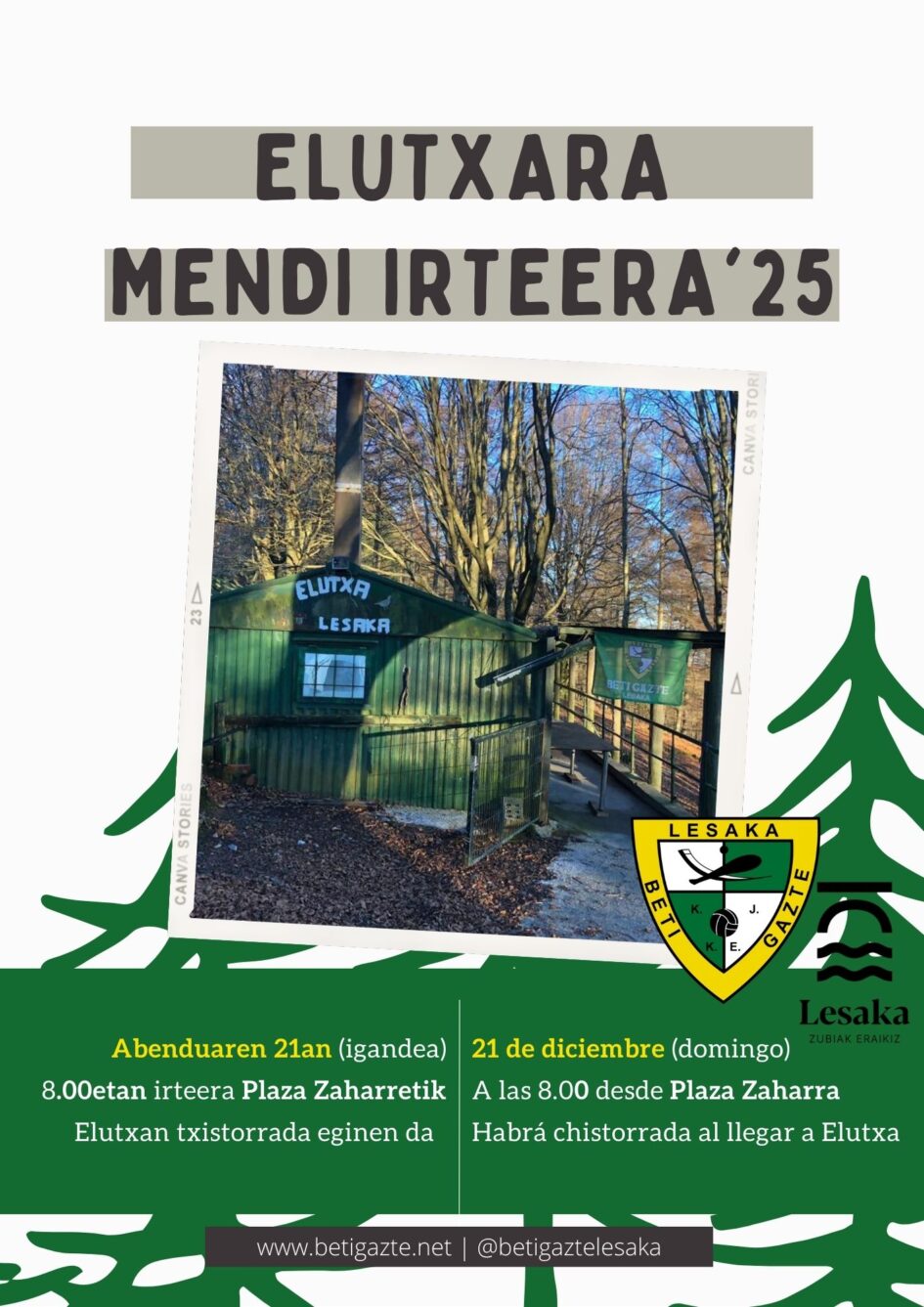 El próximo domingo, 21 de diciembre, se celebrará la ya tradicional salida montañera a Elutxa. El grupo quedará a las 8:00 en la Plaza Zaharra de Lesaka y de allí irá a Elutxa. Al llegar, se hará chistorrada.