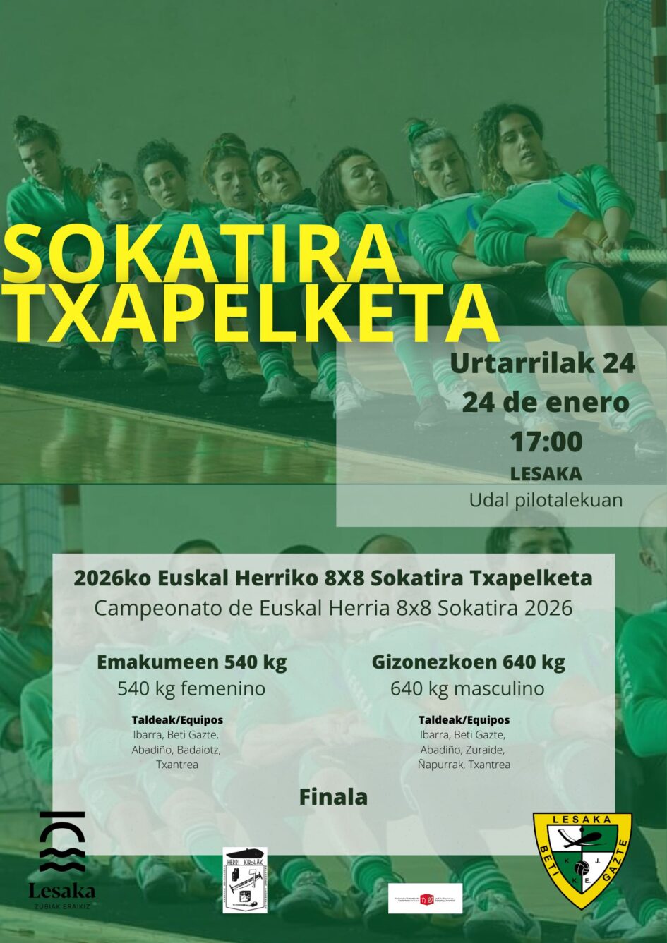 Heldu den larunbatean, urtarrilaren 24an, 17:00etatik aitzinera, Euskal Herriko 8×8 Goma Gaineko Sokatira Txapelketako jardunaldia izanen dugu Lesakan, Udal Pilotalekuan. Bertan, erabakiko dira bi kategorietako txapelak. Alde batetik, emakumeek 540 kiloan ariko dira. Lehen postuan dago gure taldea eta beraz, txapela etxean irabazteko aukera du. Bere aurkariak, Ibarra, Abadiño, Badaioz eta Txantrea izanen dira. Bertzalde, gizonak 640 kiloan ariko dira lehian. Kasu honetan lesakarrak bigarren postuan daude eta bere aurkariak Ibarra, Abadiño, Zuraide, Ñapurrak eta Txantrea izanen dira.