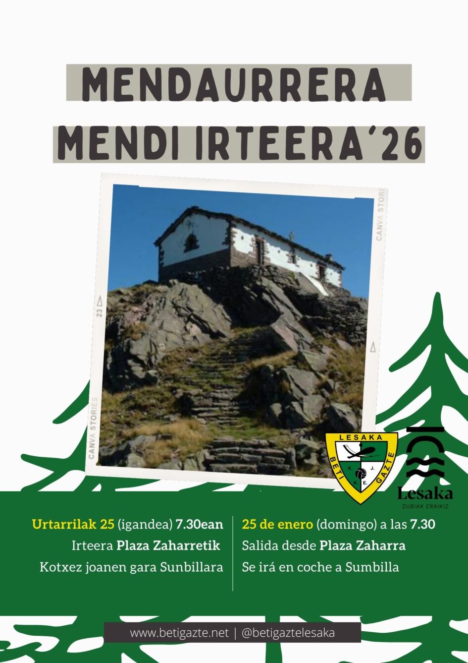 Hurrengo igandean, urtarrilaren 25ean, Mendaurrera irteera eginen du gure mendi taldeak. Goizeko 7:30ean egin dute hitzordua Lesakako Plaza Zaharrean eta hortik, Sunbillara kotxean joanen dira, ondotik Mendaur igotzen hasteko.