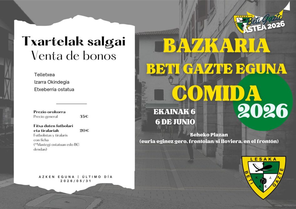 Ekainaren 6an, Beti Gazte Eguna ospatuko dugu eta eguerdian eginen dugun bazkarirako txartelak ere salgai daude dagoeneko. Telletxea estankoan, Izarra Okindegian eta Etxeberria ostatuan eros daitezke. Bazkariko txartelaren prezio orkorra 35 eurokoa izanen da. Fitxa duten futbolari eta tiralariek berriz, deskontu ttiki bat izanen dute eta 20 euroan bazkalduko dute. Azken hauek Beti Gazte dendan edo Mastegiko ostatuan eskuratu behar dute bazkarirako txartela. Txartelak eskuratzeko azken eguna maiatzaren 31a izanen da.